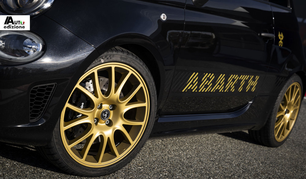 De look van de gelimiteerde Abarth 695 75° is eentje die direct lekker op het netvlies valt. De combinatie van zwart en goud, plus de nodige unieke bestickering, toont opnieuw aan dat dit niet voor niets het model is waar al jaren terecht een groot publiek aan verknocht is geraakt. Het logo van Abarth is zelfs groot op het dak te vinden en de letters op de zijkant doen wat denken aan die op de flank van de 500e i.v.m. de diagonale strepen. En deze Abarth klinkt ook even goed als altijd. De 1368cc T-Jet met Garrett GT 1446 turbocompressor produceert 180 pk en een mx. koppel van 250 Nm bij 3000 tpm. De top ligt op 225 km per uur, die je zorgeloos eens kan halen zonder al te veel op je autonomie te letten. Nul tot 100 gaat in 6,7 seconden. Het heerlijke geluid komt uit de in onze ogen legendarische Record Monza uitlaatsysteem met actieve klep. De schokdempers zijn van het type Koni FSD voor en achter. De geventileerde remschijven (305×28 mm) zijn voorzien van Brembo’s in zwart geschilderd aluminium.