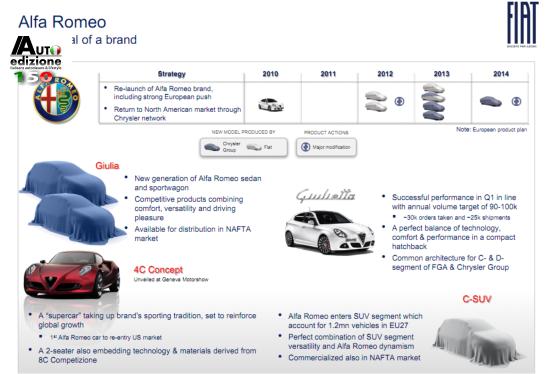 Fiat SpA heeft het exacte productieplan voor Alfa Romeo openbaar gemaakt tot 2014. Heel lang bleef het namelijk gissen geblazen, ondanks dat vorig jaar al de intenties met het merk werden bekendgemaakt. De komst van de 4C als concept, een nieuw felbevochten productieplan voor Mirafiori en de aankondiging van de Giulia zorgden de afgelopen maanden voor de nodige vragen. Om over de intenties van Volkswagen maar niet te spreken, al zijn die onderhand wel uit de wereld.