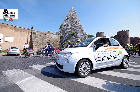 Met alle triestigheid rond de omgekomen Belgische renner, is het misschien maar beter om even op een heel andere manier naar de Giro te kijken. Zo rijdt Fiat haar eigen Giro en wel geheel elektrisch met de 500. De organisatie dat elektrisch rijden wil stimuleren CorrenteInMovimento.it (‘stroom in beweging’) organiseert een ronde van Italië die afgelopen zondag van start is gegaan. Het startpunt was bij de Cestia Piramide te Rome. Inmiddels begeeft de elektrische 500 van de ombouwfirma Micro-Vett uit Imola, zich richting de kust bij Livorno. De 500 reist niet alleen en wordt vergezeld door elektrische scooters van E-Max Italia. Door aanhoudende sterke luchtvervuiling in de Italiaanse steden, gaan er steeds meer stemmen op voor het verder ontwikkelen van het elektrisch rijden op twee- en vierwielers binnen Italië.