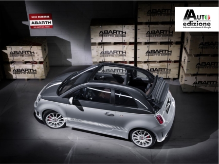 Het is tevens het debuut van een nieuwe kleurencombi op de open Abarth 500. We zien twee tonen grijs in Grigio Campovolo en Grigio Pista met een witte glanzende lijn ertussen. De ‘Record Monza’ uitlaat heeft een extra mooie sound boven de 4000 toeren. De kit bevat ook speciale geventileerde remschijven voor op de voorwielen van 284 mm. Achter zijn ze 240 mm. De remmen zijn uitgerust met high performance remblokken. De schokbrekers voor en achter zijn van Koni (FSD Valved) en de rode spiraalveren zijn korter dan de standaard exemplaren. De Esse Esse velgen bestaan uit witte of titaniumgrijze ET35 17″ velgen. De luchtfilter is ‘powered by BMC’. Verder is de EsseEsse badge op de achterklep en het motorblok terug te vinden.