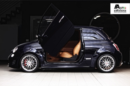 De prachtige diep donkerblauwe Abarth 500 met lederen interieur, blijkt een wolf in schaapskleren met vleugeldeuren en 260 pk. De ‘Estremo’ kit heeft evenveel vermogen dus als de unieke ‘Monza’ van vorig jaar, waar maar tien stuks van zijn gemaakt. De 500 Estremo heeft een opgerekte 1.4 Turbo met alle aanpassingen die daarbij vereist zijn zoals het injectiesysteem, de cilinders, transmissie, intercooler, koppeling, differentieel, etc. Uiteraard heeft deze creatie ook een speciale Brembo kit met 280 mm schijven voor en remklauwen met vier zuigers. Deze kit voor de remmen kost alleen al 2260 euro. De kit voor de aanpassingen van de ophanging kost 1975 euro en voor de motor 11.125 euro. Daar komen de kosten van de montage nog overheen. De Estremo heeft speciaal ontworpen 17 inch lichtmetalen spaakvelgen met daaromheen Yokohama Parada 205/40 17″ banden.
