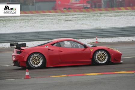 De 458 voor het GT2 klassement heet GTC en reed inderdaad een van z’n laatste proefrondjes over Fiorano. De 458 GTC zal als broertje (iets minder vermogen) van de nieuwe onlangs onthulde 458 Challenge binnenkort al aan de start verschijnen van de nodige duurraces. Om precies te zijn op de 12 uur van Sebring in de Amerikaanse Le Mans Series. Achter het stuur op de foto’s zit Jaime Melo, heeft Ferrari laten weten. De Braziliaan is in de ALMS actief met het Risi Competizione team, samen met Gianmaria Bruni en Toni Vilander. Zij stappen rechtstreeks uit een F430 GT2. Ze wonnen het afgelopen jaar de titel voor beste constructeurs in de Le Mans Cup 2010. De race in Sebring staat gepland voor 16 maart aanstaande, dus men kan nog even doorgaan met het testen onder koude, gladde en natte omstandigheden.