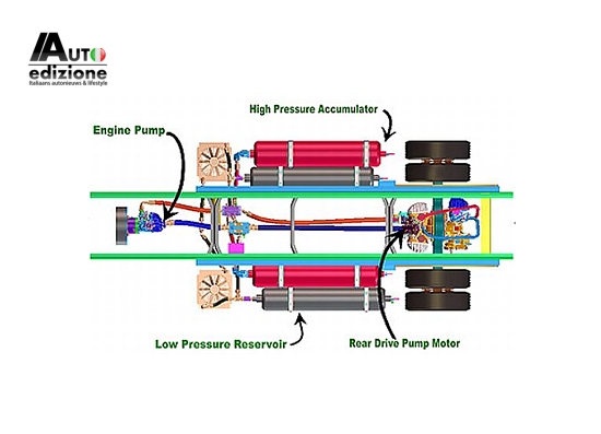Op het plaatje herken je misschien het onderstel van een vrachtwagen. Dat kan kloppen want de techniek waarover Fiat en Chrysler vandaag een persbericht naar buiten brachten, wordt momenteel alleen nog in deze tak van sport toegepast. Maar daar gaat als het aan de Italiaans-Amerikaanse combinatie ligt spoedig verandering in komen. Fiat, Chrysler en de US Enviromental Protection Agency (EPA) werken aan een hybride systeem dat niet met elektrisch energie werkt, maar met een vloeistof onder druk. De druk zorgt voor de aandrijving van de achterwielen dankzij deze vorm van kinetische energie. Dit systeem heeft de nodige voordelen op de combinatie van benzine en stroom dankzij batterijen die we nu kennen.