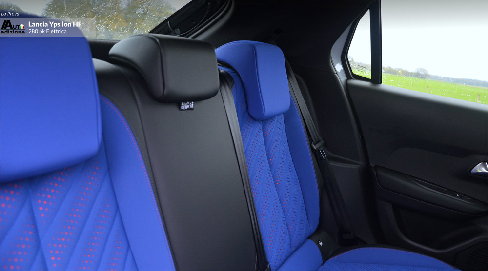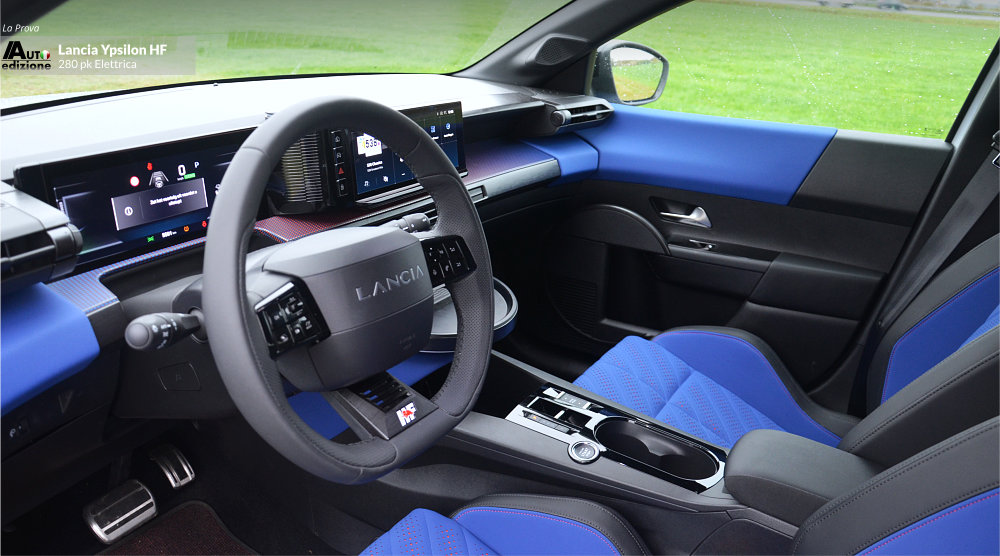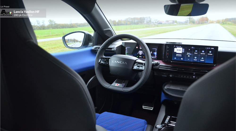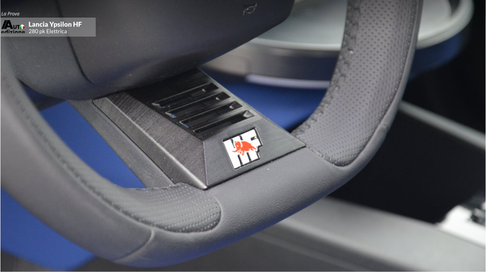 Deze Ypsilon HF is een mooi eerbetoon aan Lancia’s sportieve verleden én heden. De HF-lijn wordt vandaag de dag helemaal doorgetrokken tot diep in de rallysport. Drie varianten zijn er inmiddels: De Ypsilon HF Racing voor de instap FIA Rally6 klasse, de Rally4 HF die het langst actief is inmiddels zoals in de Trofeo Lancia. En het pas onthulde kanon, de Rally2 HF Integrale, voor het internationale FIA WRC2 klassement. De andere kant op gekeken, in Lancia’s nog beperkte gamma van de weinig geziene Ypsilon, is er de HF-Line. Modellen met minder vermogen maar wel de juiste look onder deze HF. De HF-Line is er als hybride (110 pk) en EV (156 pk). De HF maakte op ons een erg goede indruk qua rijdynamiek. Veel stuurgevoel en een onderstel dat zo rap mogelijk een bocht door lijkt te willen. Opnieuw (net als bij de Abarth en de Alfa) lijkt de boodschap ‘zo hard als jij durft’. Kart-achtig en snaar strak. Met het verschil dat de Ypsilon dat mooie lage zwaartepunt heeft van een sportauto. Dat maakt de HF tot winnaar ten opzichte van de eerder genoemde stalgenoten. Qua interieur missen we ook niets. Daar waar we de Abarth wat karig vonden afsteken, is de Ypsilon HF wél helemaal op orde. De Junior Veloce is een goede tweede maar daar wordt niet echt met leuke logo’s gespeeld. De blauwe bekleding doet het bijzonder goed op de witte HF. Onder de ventilatiegaatjes zien we oranje stof. Ook in het dashboard is gespeeld met pixels in twee contrasterende tinten. Heerlijk retromodern, Stratos-gevoel anno nu. En dan is er dat toffe stuur (die ook in de standaard Ypsilon zit) maar dan met iconische ‘HF’ badge. Het zijn de kleine dingen die ’t ‘m doen.
