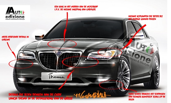 Omdat we hier niet langer bij stil willen staan zijn we voor de gelegenheid zelf gaan krabbelen op het thema ‘Thema’. Volgens onze bedrijfsarts -die sinds gister extra bezorgd is geworden- heeft dit een therapeutische werking. We hebben als een klein kind (met puntje van de tong uit je mondhoek) de herinterpretatie getekend van een Lancia op Chrysler-basis volgens het beeld waar we meer op gehoopt hadden. Vooral het afscheid van een groot deel van Lancia’s DNA (grille) dreunt vandaag nog na in ons gestel. Vandaar dit plaatje, die je overigens ook van dichtbij kunt bekijken in de gallery hieronder.