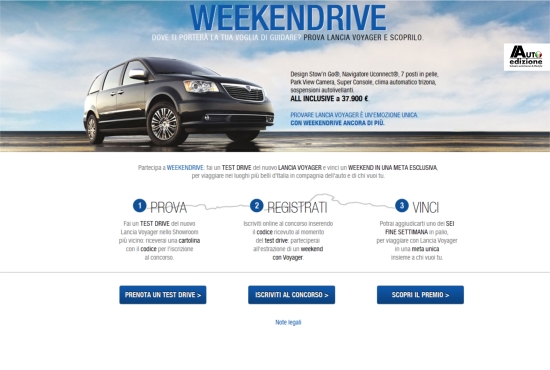 Lancia en ViaMichelin slaan de handen ineen om de perfecte reis aan te kunnen bieden in een interactie met potentiële klanten. De kracht van Lancia’s MPV zit immers in de manier van reizen, iets wat de ‘Voyager’ volop waarmaakt. Daarom komt Lancia deze zomermaanden in heel Europa met de unieke actie ‘Moving Emotions’. Kort gezegd kun je via een speciaal ingerichte website (een creatie van Bitmama) je ideale weekend weg tot in detail samenstellen. In een paar stappen maak je eerst aan Lancia eenvoudig duidelijk met wie, waar naartoe en op welke wijze je een exclusieve korte trip zou willen maken, inclusief culturele en gastronomische uitstapjes. Vervolgens krijg je de ideale invulling te zien, dankzij de suggestie die je ontvangt. Lancia laat het hier niet bij, want wie binnenkort een proefrit aanvraagt, maakt het komende half jaar kans op een geheel verzorgd weekeind op een van de door Lancia zelf gekozen 3 locaties. In Italië waar deze actie nu eerst online van start gaat is dat de kust van Amalfi gedurende de zomer, de Chianti regio aankomend najaar en de regio Trentino in de winter. De winnaar mag er zelf naar toe rijden in een luxe Voyager.