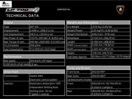 De cijfers liegen er niet om als we afgaan op het de compleet uitgelekte ‘vertrouwelijke’ info. De nieuwe V12 Supercar uit Sant Agata zal behoorlijk de toon zetten, de dag dat introductie daar is. Op de sheets zie je alle kenmerken van de auto die je waarschijnlijk nooit bij jou de straat in zult zien rijden. Tot alle kleurtjes voor het interieur aan toe. Iemand zal deze dagen z’n baan kwijt raken is onze verwachting.