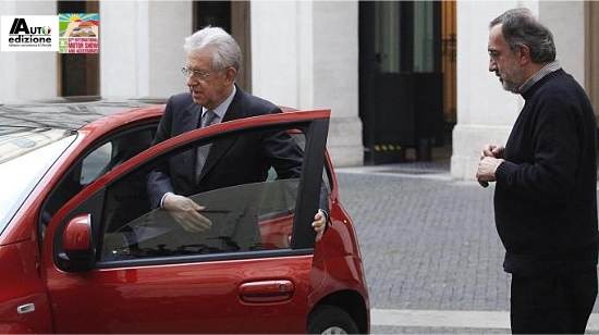 Sergio Marchionne reed eigenhandig met een Fiat Panda weer weg na zijn bezoek aan de premier in Rome. Samen met John Elkan reed de CEO in de nieuwe inventieve vijfdeurs uit Pomigliano d’Arco de binnenplaats af van Palazzo Chigi, geëscorteerd door een Fiat Freemont en een Maserati Quattroporte. De rode Panda met panoramisch glazen dak, was vandaag het symbool van de vooruitgang van Fiat en Italië. Maar het was vooral ook een teken dat de strijd tegen achteruitgang niet wordt opgegeven. Dit sterke signaal naar de buitenwereld was niet voor niets, want het bleek een zeer succesvolle ontmoeting. Het overleg duurde bijna twee uur en wat volgde was een fotosessie op de binnenplaats met de premier en de Panda. Marchionne is zoals altijd de man van de details en de juiste boodschap, want toen Monti per ongeluk voor het Fiat-logo stond, vroeg de CEO in donkere trui vriendelijk of de premier een stapje opzij wilde doen.