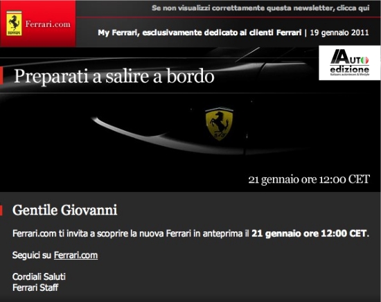 Ferrari klanten kregen vandaag een uitnodigende mail toegestuurd waarin we alvast een schim zien van de luchtinlaat aan de zijkant van project ‘F151’. Teasers zijn mode hoe vervelend ze over het algemeen ook zijn, dus overmorgen krijgt de potentiële klant van dit topmodel om 12:00 weer een glimp toegezonden. De grote Ferrari waar we steeds meer over te weten komen is duidelijk een marktintroductie waar het huis uit Maranello niet zomaar aan voorbij wil gaan. In aanloop naar de autosalon van Genève heeft Luca Cordero di Montezemolo reeds laten weten dat de auto uniek is. Afgaande op de eerste beelden en de eerste gegevens over de techniek, denken we niet dat dit slechts een goedkoop verkoop praatje is.