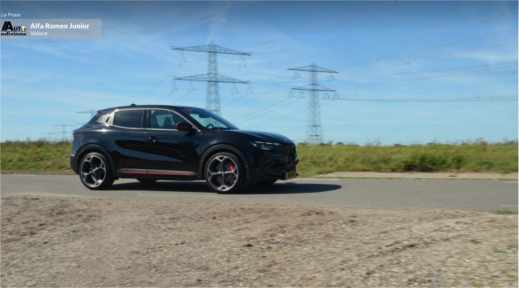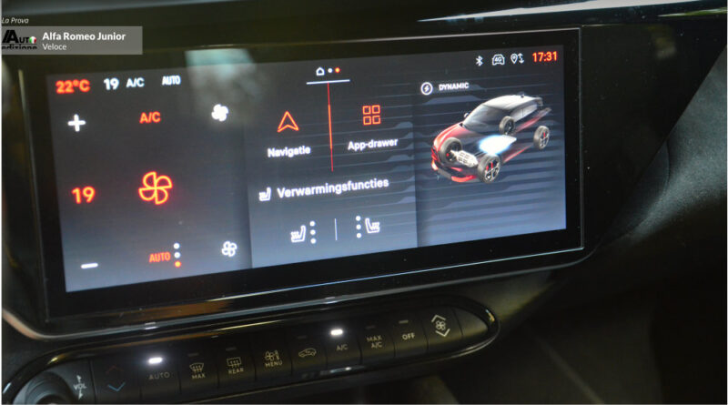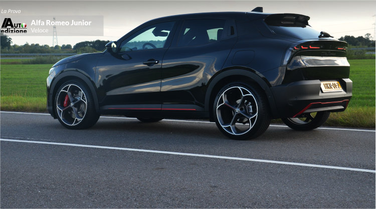 Bij de standaard Junior hebben we al uitvoerig de goede rijeigenschappen geloofd en geprezen. In tegenstelling tot de Tonale, heeft de Junior merkbaar meer van dat trouwe typische Alfa-gedrag. Goed merkbaar zodra je het stuurwiel in je handen neemt. Deze Veloce doet daar nog een schep bovenop. Dat maakt ‘m heel tof ondanks dat we het hier over een EV hebben. De Abarth 600e zit ons nog vers in het geheugen en kwam vooral heel solide en snel over. Deze Junior Veloce met evenveel pk (280 pk, 345 Nm, nul tot 100 in 5,9 sec.) moet eigenlijk hetzelfde zijn maar voelt voor ons gevoel iets meer dartel. Alsof is zich wat meer in de bochten werpt, in plaats van dat hij heel kleverig overkomt. Volgens sommigen zit het verschil bij de achterzijde maar misschien is het allemaal slechts wishful thinking. Of is het toch die 100 kg minder bij de Junior? Beide auto’s hebben trouwens een mechanisch Torsen-sperdifferentieel tussen de vooras. Dat doet natuurlijk veel op het gebied van mooi stuurwerk. Het is dat vleugje ‘Balocco’ dat door een skunkteam met klaverblaadjes op hun mouwen er op kundige wijze tussen is gesleuteld.